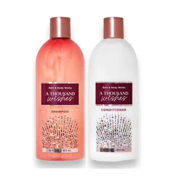 Bộ Dầu Gội & Xả hương A THOUSAND WISHES Shampoo & Conditioner Bath And Body Works vừa mới ra đời đã nhận được nhiều sự ủng hộ nồng nhiệt của các tín đồ yêu thích hương thơm. Với thành phần chứa nhiều dưỡng chất vitamin E, vitamin B5, nha đam giúp bạn có mái tóc óng mượt, mềm mại và lại thoang thoảng đủ cung bậc hương thơm từ sang trọng-tinh tế, đáng yêu-dễ thương đến lãng mạn & quyến rũ.