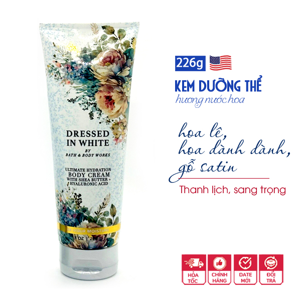 * Mùi hương: Kem dưỡng thể Dressed In White - Bath & Body Works có hương thơm siêu mát như không khí của châu Âu se lạnh. Hoa dành dành thơm bát ngát, phản phất chút phấn pha lẫn chút hương gỗ nhẹ vô cùng sang trọng. Cảm giác thật sự mới mẻ ít gặp trong vô vàn hương thơm của B&BW.