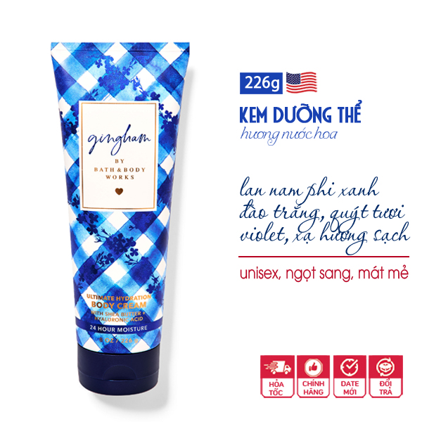 Kem dưỡng thể Gingham - Bath and Body Works thẩm thấu rất nhanh, không hề rít dính, làm mềm da, mịn da. Thành phần chủ đạo là bơ hạt mỡ, tinh dầu jojoba, vitamin E nuôi dưỡng và bảo vệ da, cung cấp siêu dưỡng chất và độ ẩm cho làn da suốt 24h.