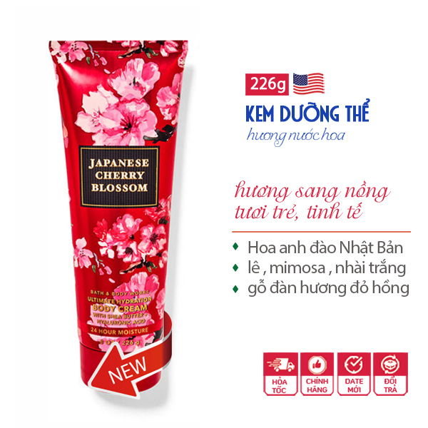 * Mùi hương: Kem dưỡng thể Japanese Cherry Blossom - Bath and Body Works là một sự pha trộn ngọt ngào của hoa anh đào Nhật Bản, quả lê tươi, cánh hoa Mimosa và gỗ đàn hương, mùi hương rất được ưa chuộng tại Mỹ.