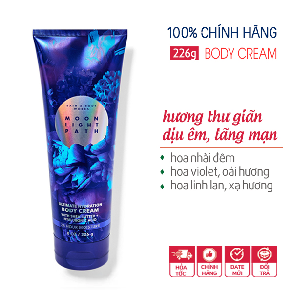 * Mùi hương: Kem dưỡng thể Moonlight Path - Bath & Body Works có mùi hương của phấn, êm dịu, đầy nữ tính. Những điểm chính: hoa nhài nở ban mai, hoa violet xanh, hoa oải hương, hoa lily của thung lũng, xạ hương mềm mại.