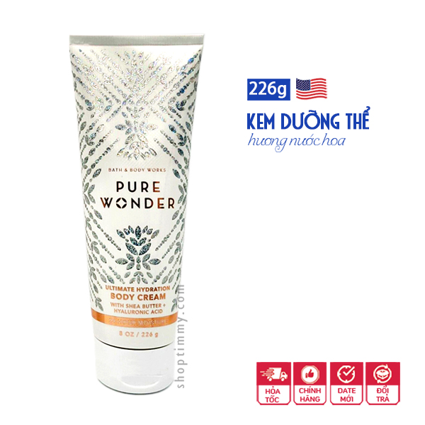 Kem dưỡng thể Pure Wonder - Bath and Body Works thẩm thấu rất nhanh, không hề rít dính, làm mềm da, mịn da. Thành phần chủ đạo là bơ hạt mỡ, tinh dầu jojoba, vitamin E nuôi dưỡng và bảo vệ da, cung cấp siêu dưỡng chất và độ ẩm cho làn da suốt 24h.