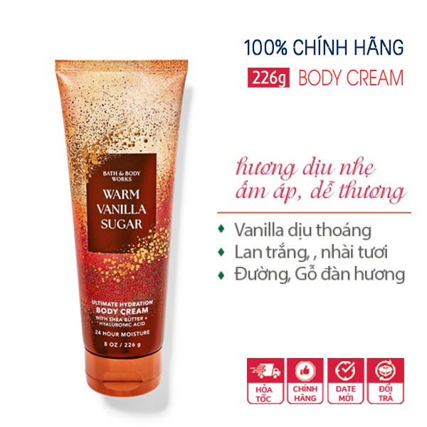 Kem dưỡng thể Warm Vanilla Sugar - Bath and Body Works thẩm thấu rất nhanh, không hề rít dính, làm mềm da, mịn da. Thành phần chủ đạo là bơ hạt mỡ, tinh dầu jojoba, vitamin E nuôi dưỡng và bảo vệ da, cung cấp siêu dưỡng chất và độ ẩm cho làn da suốt 24h.