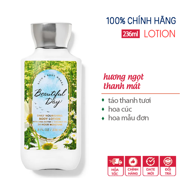 * Mùi hương: Sữa dưỡng thể Beautiful Day lotion - Bath and Body Works mùi hương thanh mát thích hợp vào mùa xuân, hè. Một sự pha trộn rất ngọt ngào của hoa cỏ ban mai và hương táo xanh dịu nhẹ, đem lại cho bạn 1 ngày tươi mới, thanh thoát và sảng khoái.