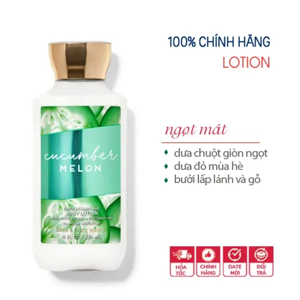 Sữa dưỡng thể Cucumber Melon - Bath & Body Works có hương thơm ngọt ngào, đáng yêu của quả Dưa Gang + Dưa Chuột thanh tao nhẹ mát + Dưa Hoàng Kim (dưa lưới) tươi mát & hương Soda Bưởi thư giãn nhẹ nhàng