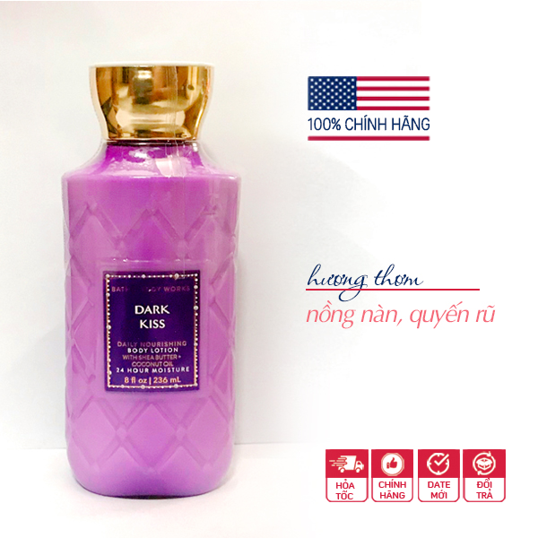 Sữa dưỡng thể Dark Kiss lotion - Bath and Body Works thẩm thấu rất nhanh, không hề rít dính, làm mềm da, mịn da. Thành phần chủ đạo là bơ hạt mỡ, tinh dầu jojoba, vitamin E nuôi dưỡng và bảo vệ da, cung cấp siêu dưỡng chất và độ ẩm cho làn da suốt 24h.