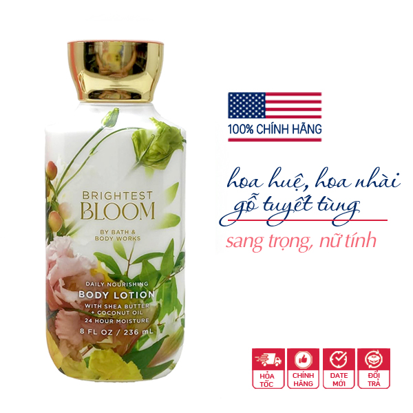 Sữa dưỡng thể Brightest Bloom - Bath & Body Works có hương thơm của hoa linh lan, nhài leo, cẩm chướng và cả gỗ tuyết tùng tươi. Hương thơm dễ dùng, nữ tính, gợi cảm và tự nhiên sang trọng của dòng hoa bloom.