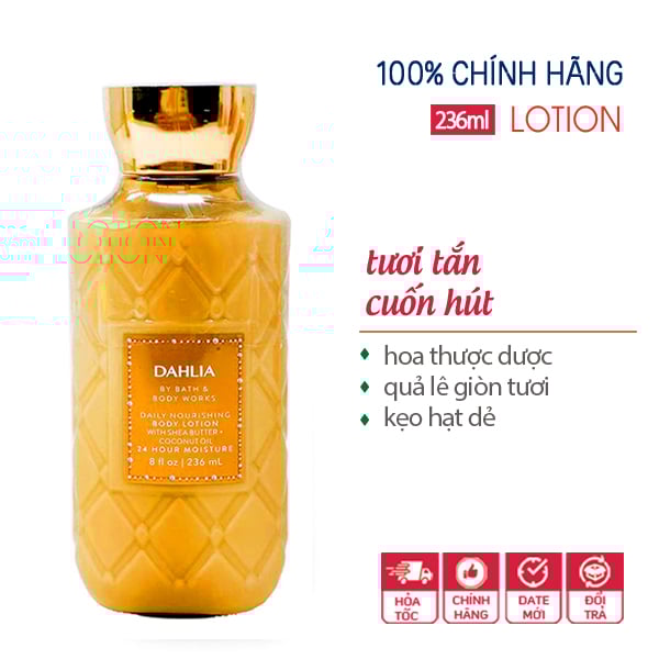 Sữa dưỡng thể hương nước hoa Dahlia - Bath & Body Works có mùi hương tươi sáng và đầy hoa với một chút quyến rũ, hấp dẫn. Huwowngt thơm là sự pha trộn tuyệt đẹp của cánh hoa thược dược, quả lê giòn và praline (kẹo hạt dẻ)