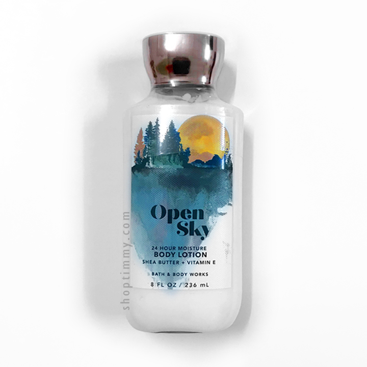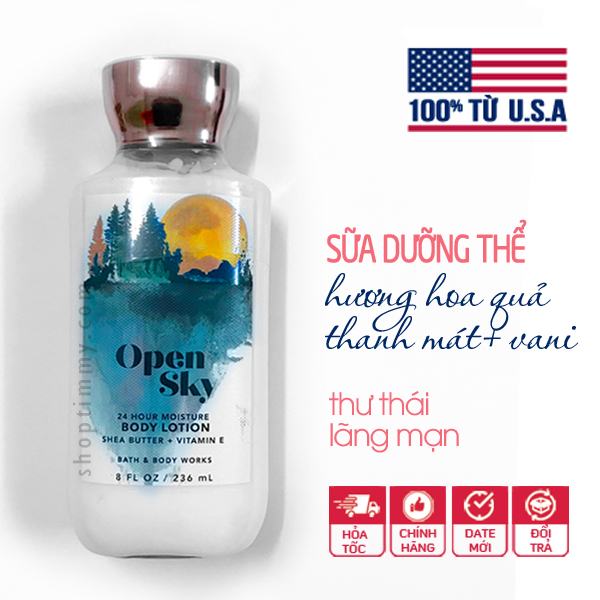 + Sữa dưỡng thể hương nước hoa Open Sky - Bath & Body Works có hương thơm sạch sẽ, dễ dịu, là một không khí của bầu trời trong xanh trong một ngày đẹp hoàn hảo của tiết trời se mát, cảm giác ấm áp, lãng mạn của thu đông. Open sky như một người con gái đẹp dịu dàng, ấm áp, tươi trẻ. Nhìn chung Open Sky mang một mùi hương tươi mát, ngọt thanh, note trầm ấm về sau. Hương không nồng, không ngọt lắm, phù hợp để dùng quanh năm.