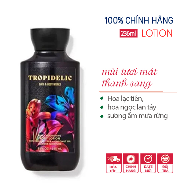 Sữa dưỡng thể Tropidelic - Bath & Body Works có mùi hương giữa hoa lạc tiên, hoa ngọc lan tây và chút sương ẩm nhẹ nhàng của rừng mưa nhiệt đới.