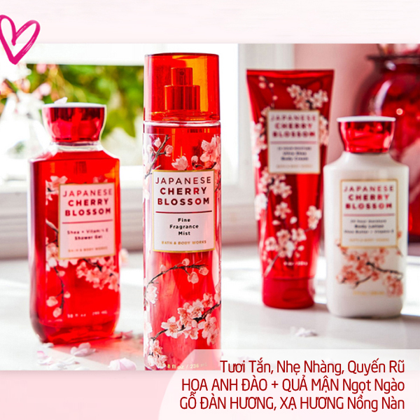 Bộ Sữa tắm, xịt thơm, dưỡng da lưu hương toàn thân Japanese Cherry - Blossom Bath & Body Works sản phẩm best-seller của hãng. Mùi thơm ngọt vừa quyến rũ vừa ngọt ngào, thanh thanh, dễ chịu. Thích hợp mọi độ tuổi, đi làm, đi chơi, suốt 4 mùa.