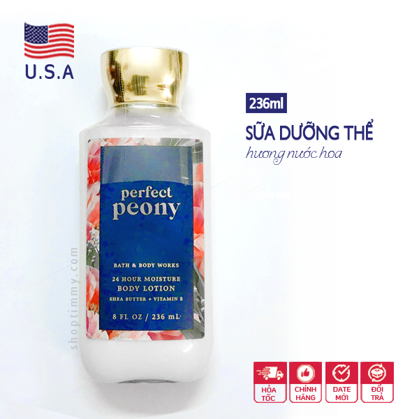 Sữa dưỡng thể Perfect Peony - Bath and Body Works thẩm thấu rất nhanh qua da, làm mềm da, mịn da mà không rít dính, thành phần chủ đạo bơ hạt mỡ, tinh dầu jojoba, vitamin E nuôi dưỡng và bảo vệ da, cung cấp siêu dưỡng chất và độ ẩm cho làn da suốt 24 tiếng.