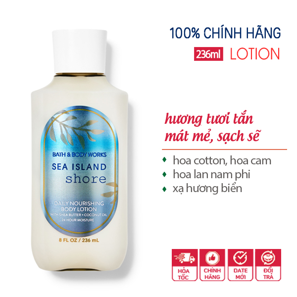 Sữa dưỡng thể Sea Island Shore - Bath and Body Works thẩm thấu rất nhanh, không hề rít dính, làm mềm da, mịn da. Thành phần chủ đạo là bơ hạt mỡ, tinh dầu jojoba, vitamin E nuôi dưỡng và bảo vệ da, cung cấp siêu dưỡng chất và độ ẩm cho làn da suốt 24h.