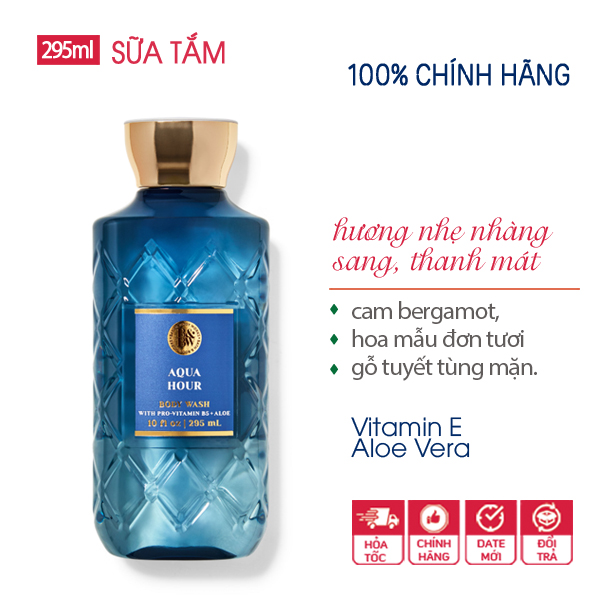 Sữa tắm Aqua Hour dưỡng ẩm lưu hương sang trọng thanh mát của thương hiệu Bath and Body Works đến từ Mỹ. Đây là thương hiệu có uy tín lâu năm trong ngành công nghiệp chăm sóc cơ thể, nguyên liệu chủ yếu từ thiên nhiên, không gây kích ứng cho da.