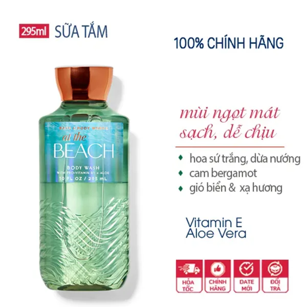 Sữa tắm dưỡng ẩm vitamin E & lô hội mùi hương At The Beach của thương hiệu Bath and Body Works đến từ Mỹ. Đây là thương hiệu có uy tín lâu năm trong ngành công nghiệp chăm sóc cơ thể, nguyên liệu chủ yếu từ thiên nhiên, không gây kích ứng cho da.