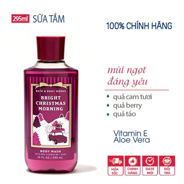 Sữa tắm dưỡng ẩm vitamin E & lô hội mùi hương Bright Christmas Morning của thương hiệu Bath and Body Works đến từ Mỹ. Đây là thương hiệu có uy tín lâu năm trong ngành công nghiệp chăm sóc cơ thể, nguyên liệu chủ yếu từ thiên nhiên, không gây kích ứng cho da.