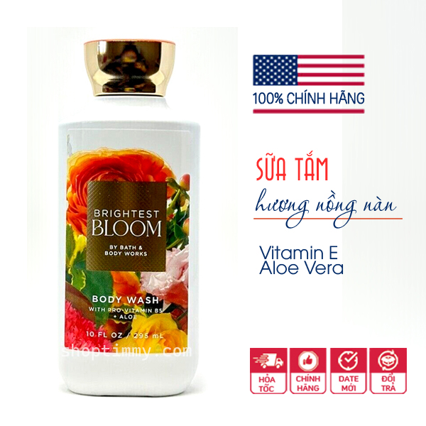 Sữa tắm dưỡng ẩm vitamin E & lô hội hương Brightest Bloom của thương hiệu Bath and Body Works đến từ Mỹ. Đây là thương hiệu có uy tín lâu năm trong ngành công nghiệp chăm sóc cơ thể, nguyên liệu chủ yếu từ thiên nhiên, không gây kích ứng cho da.