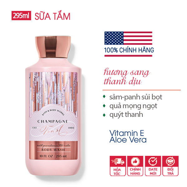 Sữa tắm Champagne Toast Bath & Body Works nhập chính hãng từ Mỹ làm sạch da, cung cấp thêm độ ẩm và giữ được hương thơm lâu hơn. Sữa tắm BBW không lưu mùi đậm đặc như khi dùng nước hoa, mà sẽ chỉ thoang thoảng trên da, ẩn ẩn hiện hiện, lưu giữ hương như chính mùi cơ thể vậy, tăng thêm sức quyến rũ cho cơ thể.
