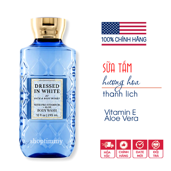 Sữa tắm dưỡng ẩm vitamin E & lô hội hương Dressed In White của thương hiệu Bath and Body Works đến từ Mỹ. Đây là thương hiệu có uy tín lâu năm trong ngành công nghiệp chăm sóc cơ thể, nguyên liệu chủ yếu từ thiên nhiên, không gây kích ứng cho da.