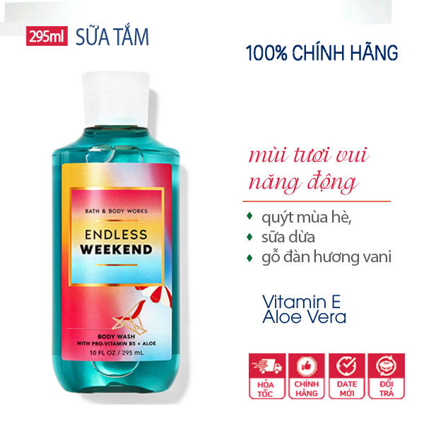 Sữa tắm dưỡng ẩm vitamin E & lô hội mùi hương Endless Weekend của thương hiệu Bath and Body Works đến từ Mỹ. Đây là thương hiệu có uy tín lâu năm trong ngành công nghiệp chăm sóc cơ thể, nguyên liệu chủ yếu từ thiên nhiên, không gây kích ứng cho da.