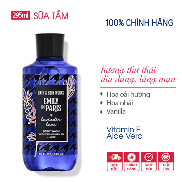 Sữa tắm Lavender Luxe | Emily in Paris của thương hiệu Bath and Body Works đến từ Mỹ. Đây là thương hiệu có uy tín lâu năm trong ngành công nghiệp chăm sóc cơ thể, nguyên liệu chủ yếu từ thiên nhiên, không gây kích ứng cho da.