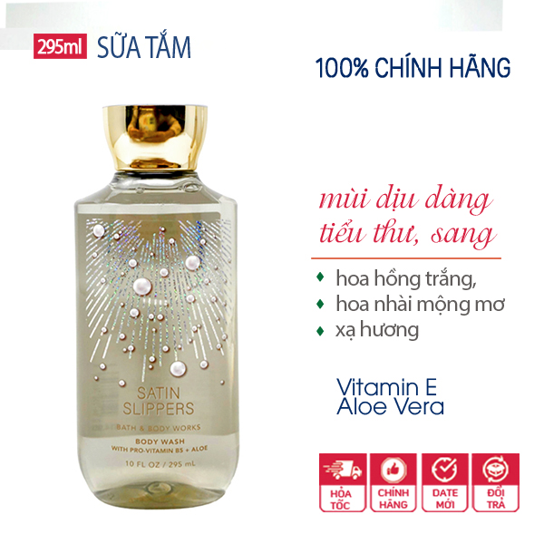 Sữa tắm dưỡng ẩm vitamin E & lô hội mùi hương Satin Slippers của thương hiệu Bath and Body Works đến từ Mỹ. Đây là thương hiệu có uy tín lâu năm trong ngành công nghiệp chăm sóc cơ thể, nguyên liệu chủ yếu từ thiên nhiên, không gây kích ứng cho da.