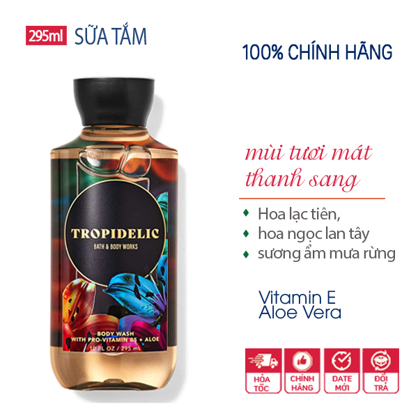 Sữa tắm dưỡng ẩm vitamin E & lô hội mùi hương Tropidelic của thương hiệu Bath and Body Works đến từ Mỹ. Đây là thương hiệu có uy tín lâu năm trong ngành công nghiệp chăm sóc cơ thể, nguyên liệu chủ yếu từ thiên nhiên, không gây kích ứng cho da.