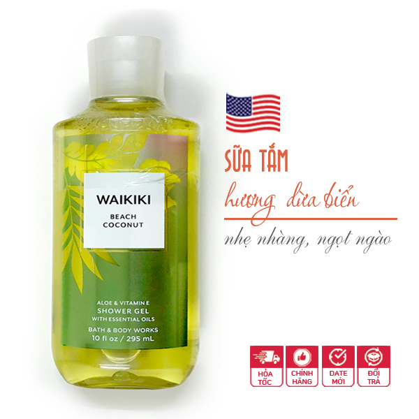 Sữa tắm dưỡng ẩm Waikiki Beach Coconut vitamin E - bath and body works làm sạch da, cung cấp thêm độ ẩm làm mềm da, lưu hương thoang thoảng như chính mùi hương cơ thể.