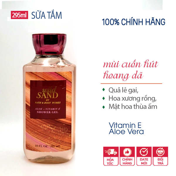 Sữa tắm dưỡng ẩm vitamin E & lô hội mùi hương Wild Sand của thương hiệu Bath and Body Works đến từ Mỹ. Đây là thương hiệu có uy tín lâu năm trong ngành công nghiệp chăm sóc cơ thể, nguyên liệu chủ yếu từ thiên nhiên, không gây kích ứng cho da.