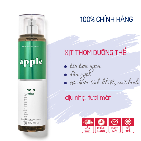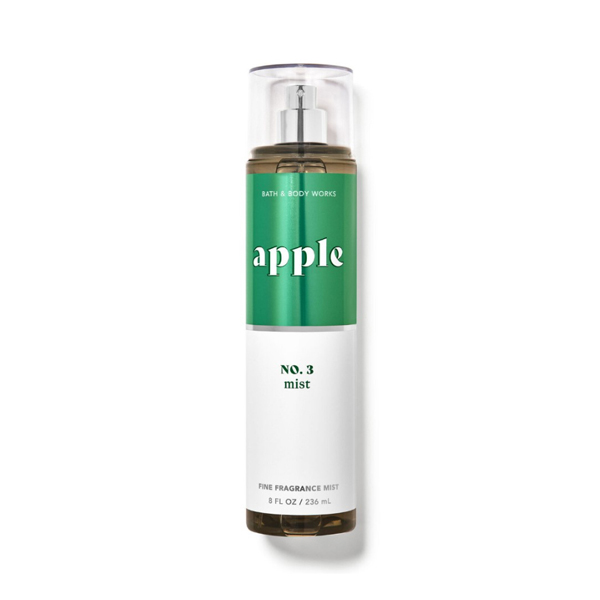 Xịt thơm toàn thân body mist Apple tươi mát - Bath and Body Works có hương thơm tươi sáng thuần khiết của trái cây dâu và táo. Apple No.3 mang hương chủ đạo xuyên suốt của táo xanh kết hợp với sự tinh khết của 1 cơn mưa rào. Tone mùi thanh mát, nhẹ nhàng cực dễ chịu & siêu nịnh mũi.