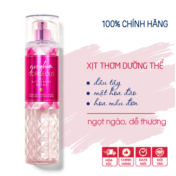 Xịt thơm toàn thân body mist Gingham Gorgeous - Bath and Body Works là một mùi hương trái cây mix hoa. Tổng thể mùi hương có chút mát mẻ, dịu dàng và dễ thương