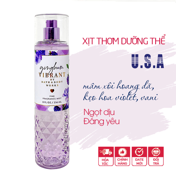 Xịt thơm toàn thân body mist Gingham Vibrant hương nhẹ nhàng - Bath and Body Works dành cho các bạn thích mùi hoa hay trái cây nhẹ nhàng, nữ tính. Có thể sử dùng hằng ngày đi học, đi làm… Hương thơm gây nghiện nhè nhẹ ngọt ngào đáng yêu yêu.