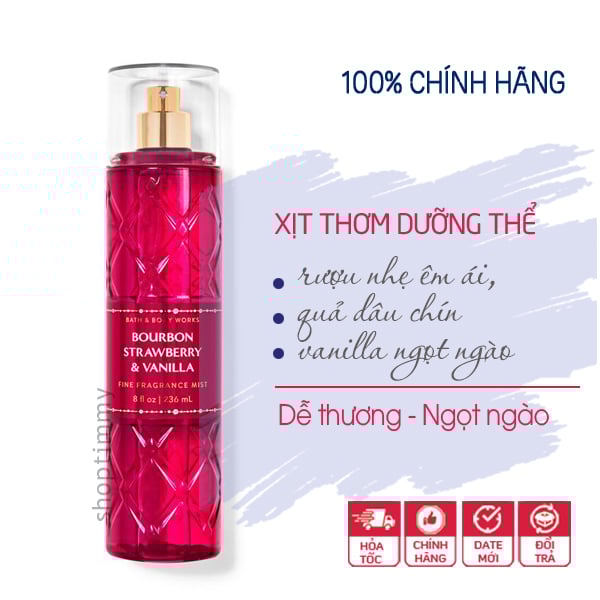 Xịt thơm toàn thân Bourbon Strawberry & Vanilla body mist - Bath and Body Works là một loại xịt phun sương nhằm cung cấp độ ẩm, khoáng chất và các loại vitamin cho làn da kèm theo chức năng chính là lưu lại hương thơm như nước hoa đủ các mùi tươi mới, dễ chịu hoặc nồng nàn, cá tính cho da.