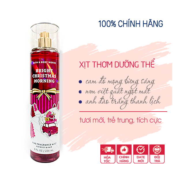 Xịt thơm toàn thân Bright Christmas Morning body mist - Bath and Body Works là một loại xịt phun sương nhằm cung cấp độ ẩm, khoáng chất và các loại vitamin cho làn da kèm theo chức năng chính là lưu lại hương thơm như nước hoa đủ các mùi tươi mới, dễ chịu hoặc nồng nàn, cá tính cho da.