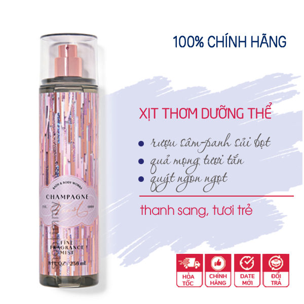 Xịt thơm toàn thân Champagne Toast body mist - Bath and Body Works nồng ấm và cuồng nhiệt với hương thơm từ rịu champagne, chambord nho đen, mật hoa và một xíu xạ hương. Tone trái cây ngọt nhẹ, nồng ấm, dễ say, nhẹ nhàng, nhưng lãng mạn và sang trọng.