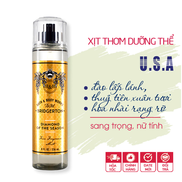 Xịt thơm toàn thân Diamond of the Season Bridgerton body mist - Bath and Body Works là một loại xịt phun sương nhằm cung cấp độ ẩm, khoáng chất và các loại vitamin cho làn da kèm theo chức năng chính là lưu lại hương thơm như nước hoa đủ các mùi tươi mới, dễ chịu hoặc nồng nàn, cá tính cho da.