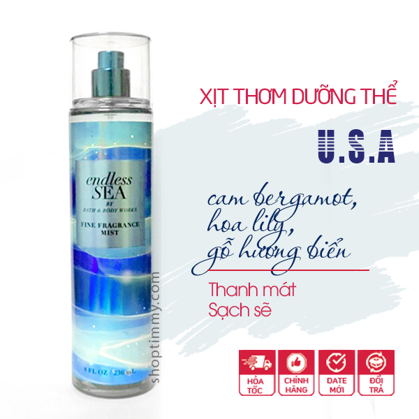 Xịt thơm toàn thân Endless Sea body mist - Bath and Body Works là một loại xịt phun sương nhằm cung cấp độ ẩm, khoáng chất và các loại vitamin cho làn da kèm theo chức năng chính là lưu lại hương thơm như nước hoa đủ các mùi tươi mới, dễ chịu hoặc nồng nàn, cá tính cho da.