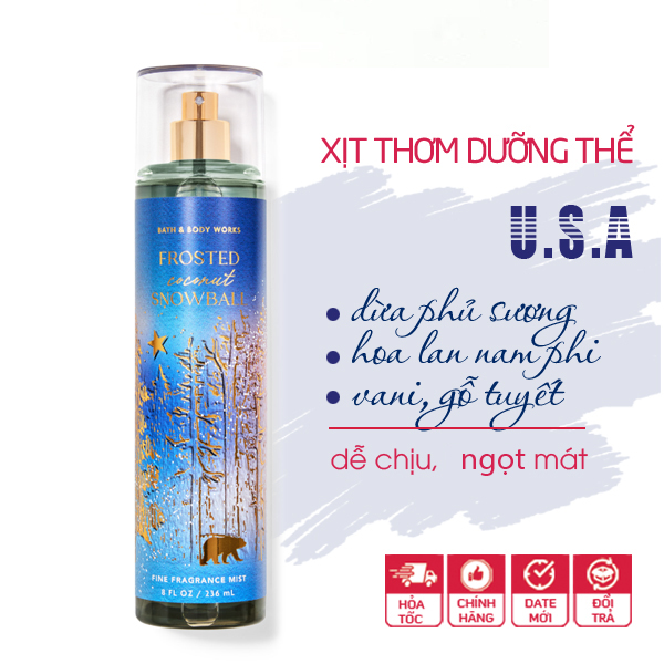 Xịt thơm toàn thân Frosted Coconut Snowball - Bath & Body Works mang hương Dừa phủ sương, Vani, hoa Lan + gỗ thông thiên nhiên siêu siêu lạ, rất thú vị. Mùi dừa mát lạnh, dễ chịu không kén thời tiết.
