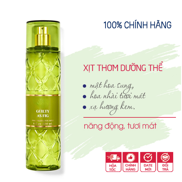 Xịt thơm toàn thân Guilty As Fig body mist - Bath and Body Works là một loại xịt phun sương nhằm cung cấp độ ẩm, khoáng chất và các loại vitamin cho làn da kèm theo chức năng chính là lưu lại hương thơm như nước hoa đủ các mùi tươi mới, dễ chịu hoặc nồng nàn, cá tính cho da.