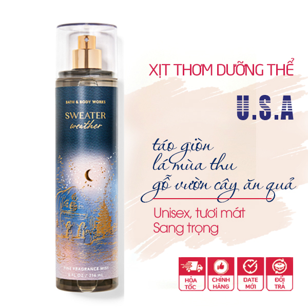 Xịt thơm toàn thân Sweater Weather - Bath & Body Works mang đến cảm nhận bầu không khí mát lạnh của 1 ngày mùa thu mát mẻ trong chiếc áo len yêu thích của bạn.