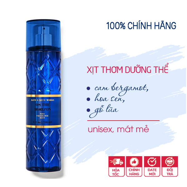 Xịt thơm toàn thân On The Horizon body mist - Bath and Body Works là một loại xịt phun sương nhằm cung cấp độ ẩm, khoáng chất và các loại vitamin cho làn da kèm theo chức năng chính là lưu lại hương thơm như nước hoa đủ các mùi tươi mới, dễ chịu hoặc nồng nàn, cá tính cho da.