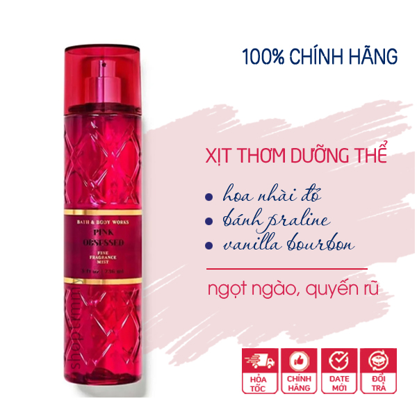 Xịt thơm toàn thân Pink Obsessed body mist - Bath and Body Works là một loại xịt phun sương nhằm cung cấp độ ẩm, khoáng chất và các loại vitamin cho làn da kèm theo chức năng chính là lưu lại hương thơm như nước hoa đủ các mùi tươi mới, dễ chịu hoặc nồng nàn, cá tính cho da.