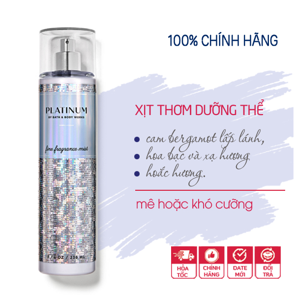Xịt thơm toàn thân Platinum body mist - Bath and Body Works là một loại xịt phun sương nhằm cung cấp độ ẩm, khoáng chất và các loại vitamin cho làn da kèm theo chức năng chính là lưu lại hương thơm như nước hoa đủ các mùi tươi mới, dễ chịu hoặc nồng nàn, cá tính cho da.