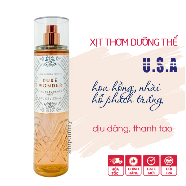 Xịt thơm body Pure Wonder dưỡng ẩm lưu hương cơ thể - Bath and Body Works là mùi thiên về hoa, nhưng nhẹ và thanh, không quá nồng hay quá ngọt, rất dễ chịu. Hương thơm Pure Wonder lưu lại trên da mùi phấn hoa phảng phất, ngọt nhẹ, trầm ấm. Mùi hương có tí trưởng thành sẽ thích hợp các bạn đã đi làm, có thể sử dùng quanh năm không kén thời tiết.