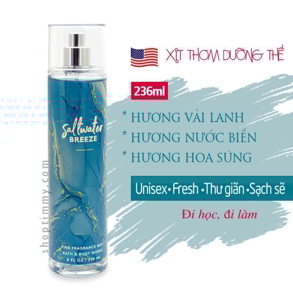 Xịt thơm body Saltwater Breeze dưỡng ẩm lưu hương cơ thể - Bath and Body Works có hương thơm thanh lịch, tinh tế của vải lanh nhẹ, xen hương nước biển và hoa súng.