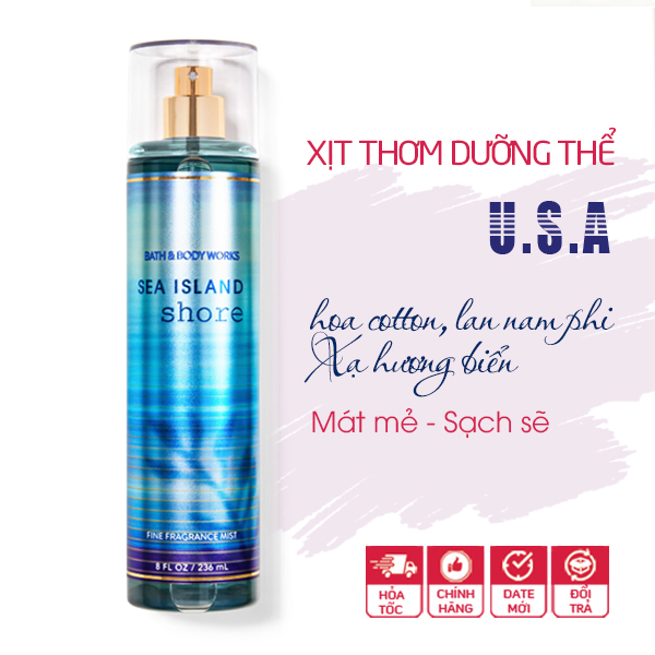 Xịt thơm toàn thân Sea Island Shore body mist - Bath and Body Works là bản sao của Sea Island Cotton vừa vắng bóng 1 thời gian nay thay tên đổi họ quay trở lại với chúng ta nè. Hãy lại cùng tận hưởng làn không khí mát fresh thư thái và thanh khiết của hương biển đảo biển thư thái này nhé. Từ thiết kế đến mùi hương đều đem lại cho mình cảm giác thoáng mát và sạch sẽ thuần khiết nha. Các bạn sẽ tỏa ra một mùi hương của hoa Cotton trắng tinh khiết hòa quyện trong làn gió biển man mác, cứ như hương quần áo mới sảng khoái và vô cùng thư giãn.