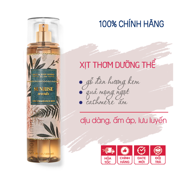 Xịt thơm toàn thân Sunrise Woods - Bath & Body Works là mùi hương của kem gỗ đàn hương, quả mọng ngọt ngào, cashmere ấm cúng. Hương ngọt nhẹ của quả mọng, lưu hương nồng ấm trên da với mùi kem gỗ beo béo, mê hoặc, cuốn hút. Sử dụng vào ngày mát hoặc vào mùa thu, đông.