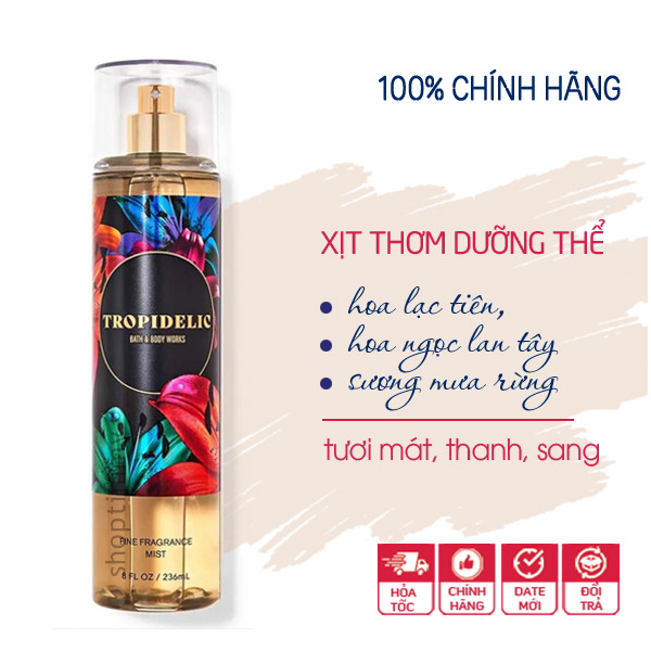 Xịt thơm toàn thân Tropidelic body mist - Bath and Body Works là một loại xịt phun sương nhằm cung cấp độ ẩm, khoáng chất và các loại vitamin cho làn da kèm theo chức năng chính là lưu lại hương thơm như nước hoa đủ các mùi tươi mới, dễ chịu hoặc nồng nàn, cá tính cho da.