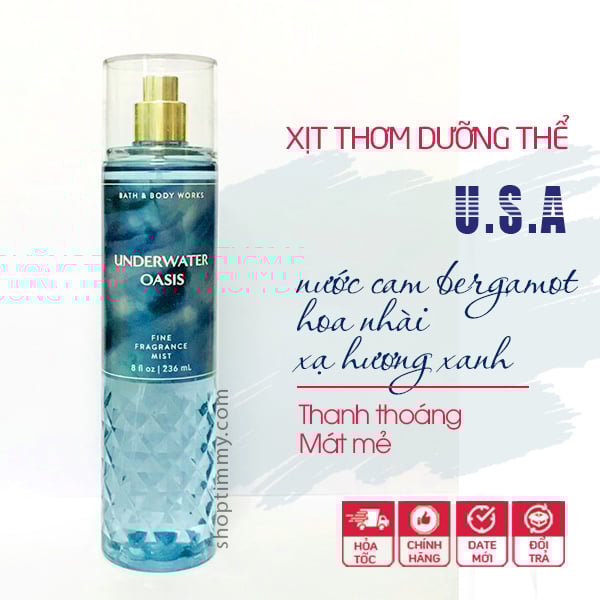 Xịt thơm toàn thân Underwater Oasis body mist - Bath and Body Works là một loại xịt phun sương nhằm cung cấp độ ẩm, khoáng chất và các loại vitamin cho làn da kèm theo chức năng chính là lưu lại hương thơm như nước hoa đủ các mùi tươi mới, dễ chịu hoặc nồng nàn, cá tính cho da.