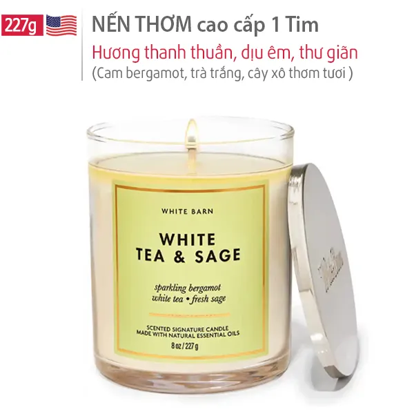 Nến Sáp Thơm Phòng White Tea & Sage cao cấp hương thư giãn - Bath & Body Works có hương thơm thư giãn dễ chịu từ cam bergamot lấp lánh, trà trắng và cây xô thơm tươi. Hương thơm thanh thuần, êm dịu giúp xua tan căng thẳng, mệt mỏi.
